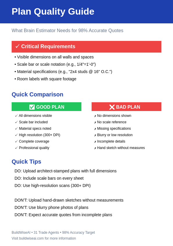Our Brain Estimator uses 31 specialized trade agents to analyze your construction plans and deliver 98% accurate quotes. Each agent needs visible dimensions,scale references, and clear specifications to perform accurate take-offs. Plans without these details will result in rough ballpark estimates only.
